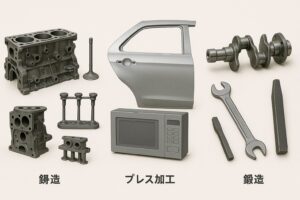 代表的なものに鋳造(溶かした金属を型に流し込む)、プレス加工(板金を金型で打ち抜く・曲げる)、鍛造(加熱した金属を叩いて成形)などがあります。