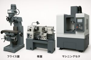 フライス盤、旋盤、マシニングセンタは、機械加工でよく使われる主要な工作機械です。