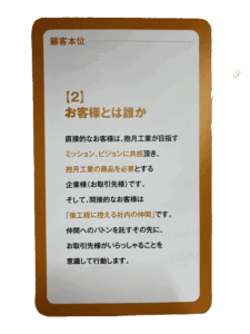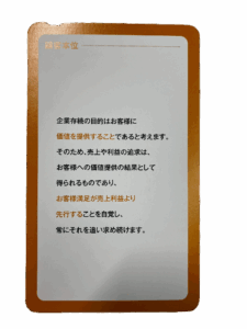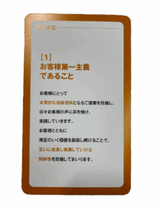 クレドカード『【1】お客様第一主義であること』では、顧客の声に耳を傾け、本質的な価値提供を第一に考えた提案・行動を重ねることの重要性が強調されています。